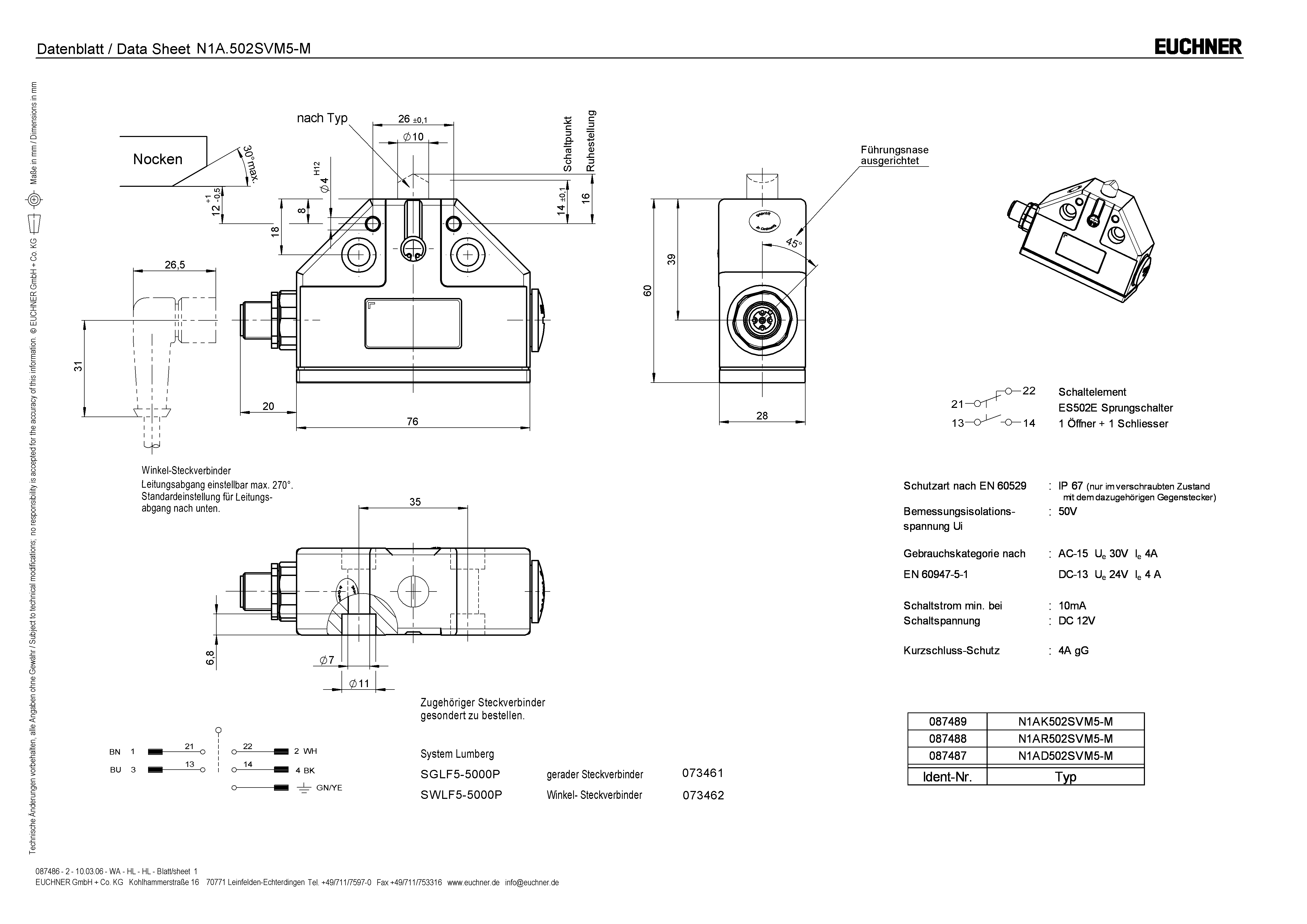 Přesný samostatný koncový spínač N1A, stříškový plunžr, konektor M12