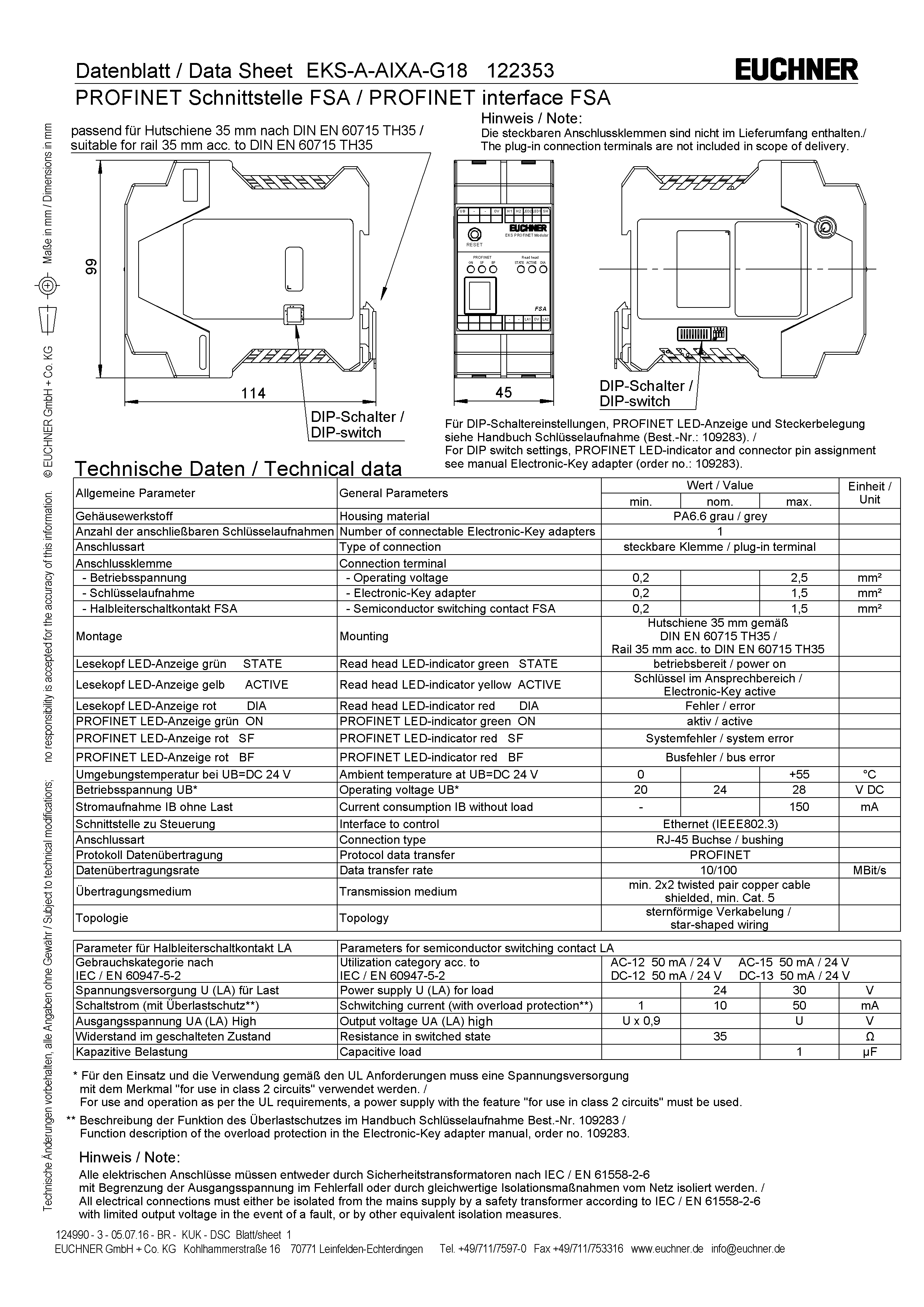 Electronic-Key-System Manual EKS and EKS FSA with PROFINET IO interface Compact from V3.X.X, Modular from V1.1.X
