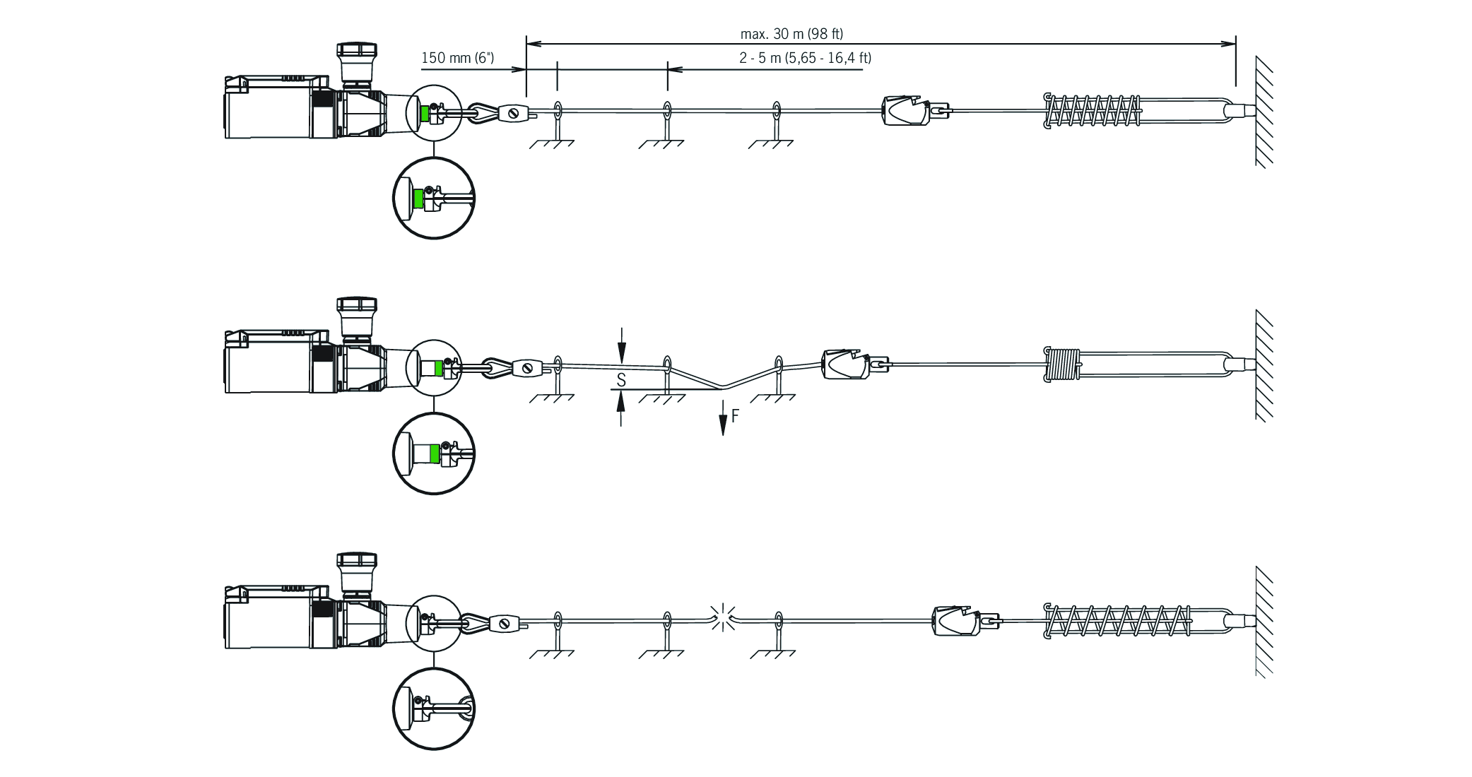 Aby toho bylo dosaženo, má spínač tažného lana střední polohu a dvě polohy vypnutí. Během provozu stroje je spínač ve střední poloze. Pokud dojde k vytažení nebo přetržení bezpečnostního lana, spínač se přesune ze středové polohy do jedné z vypínacích poloh a stroj se zastaví. Napnutí lana je indikováno zeleným polem, které je viditelné, když je lano napnuté.