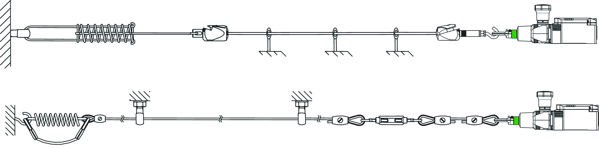 - Připevněte napínací lano k protikusu pomocí napínací pružiny lana nebo protikusu a veďte ho přes opěrné body.