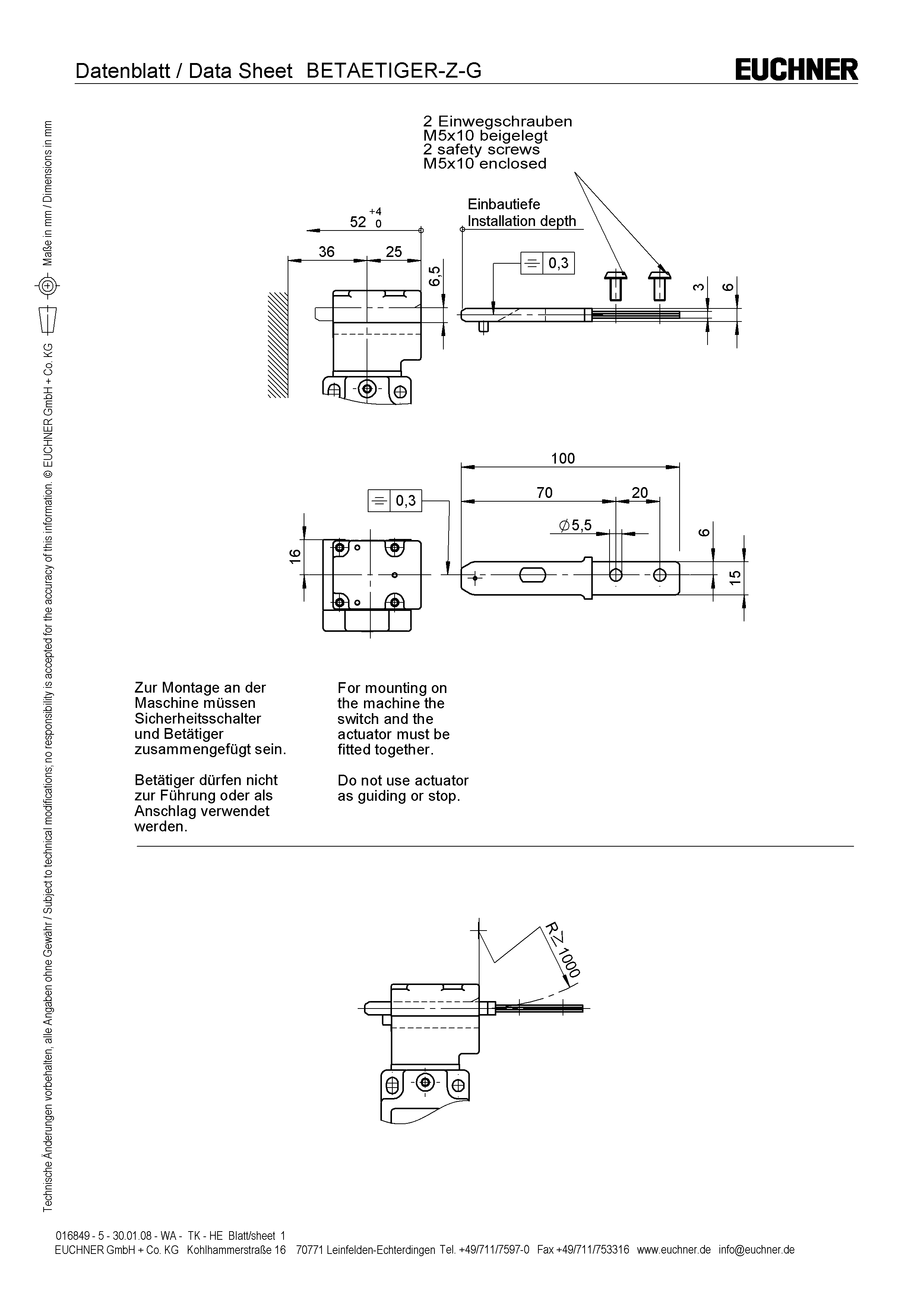 The straight actuator is used on sliding doors or hinged doors with door radii greater than 1,000 mm. Safety screws prevent unscrewing of the actuators. The safety screws included can be inserted with a normal tool, but cannot be removed again.