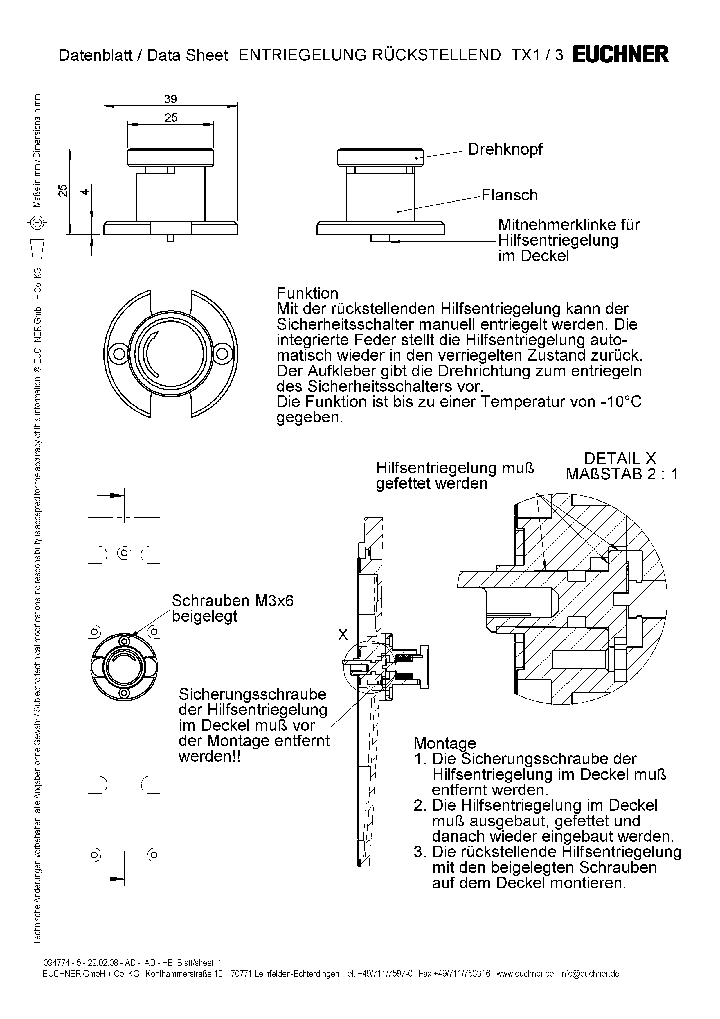 Attention: Prior to mounting, the locking screw for the auxiliary release must be removed.