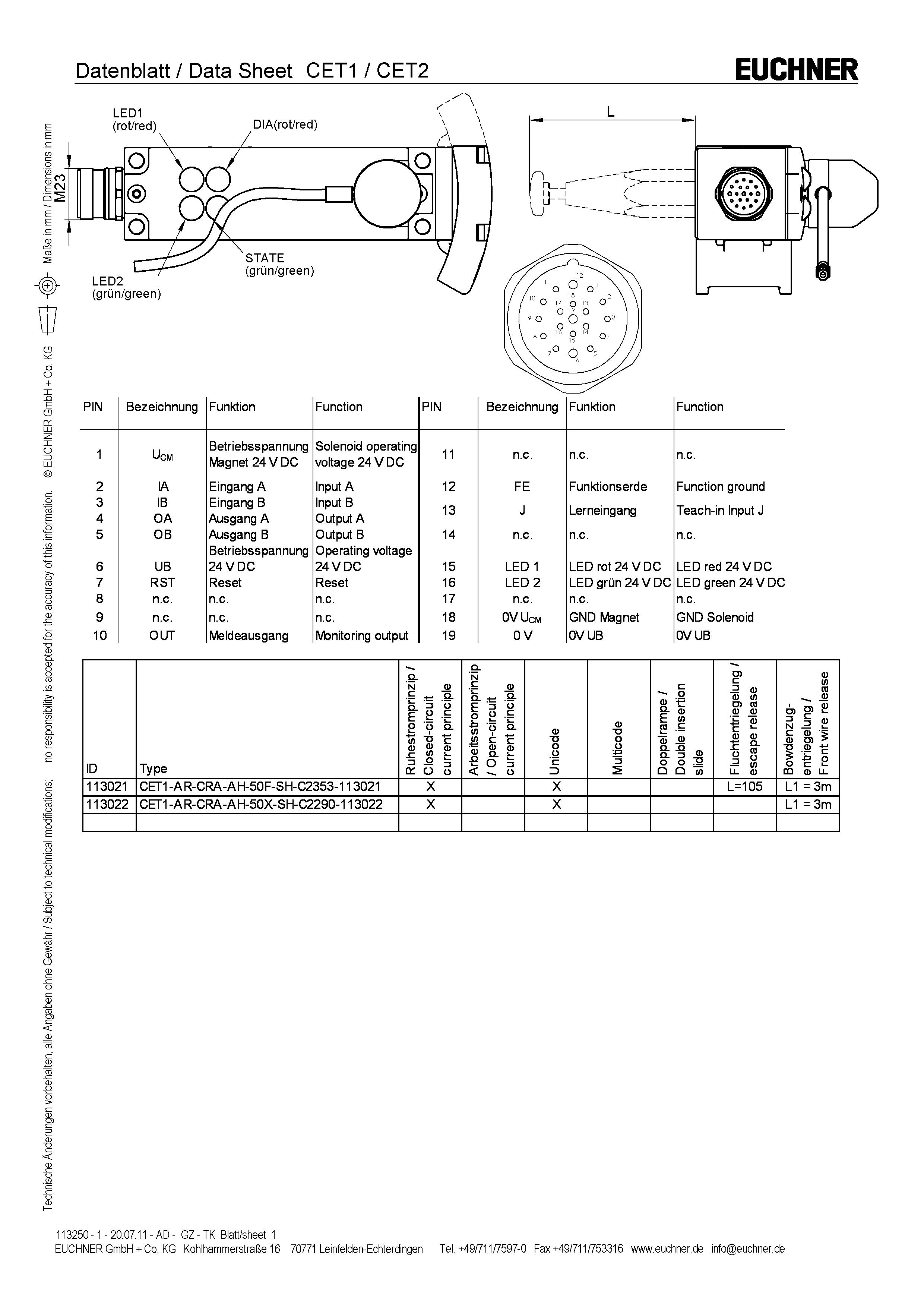Safety switch with guard locking CET-AR-..., RFID, plug connector(s) M23 (RC18), wire front release (bowden)