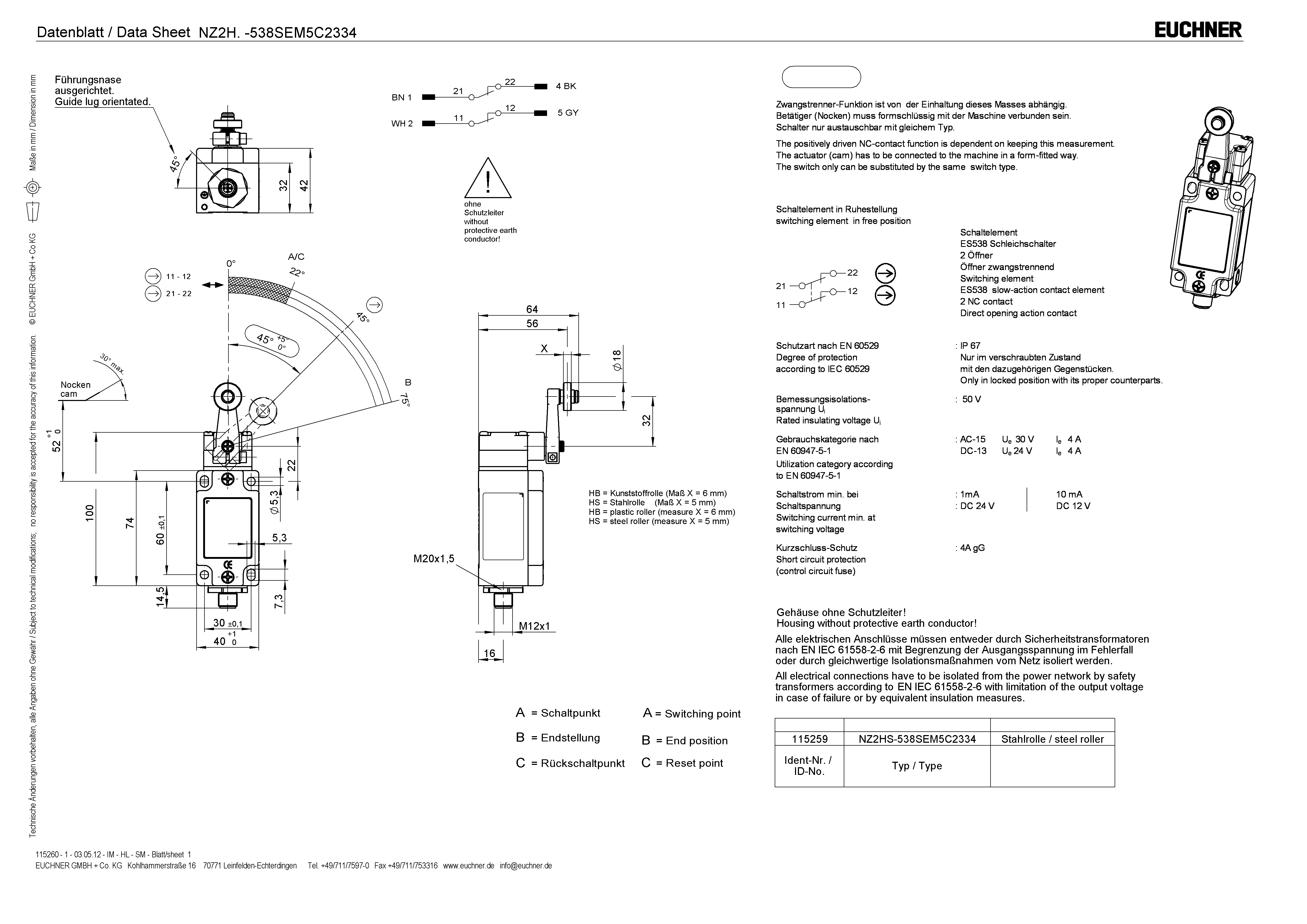 HomeProdukteElectromechanical safety switches without guard lockingN1A / NB01 Single Limit Switch, NZ position switch and EGZ single fixing limit switchNZ2HS-538SEM5C2334