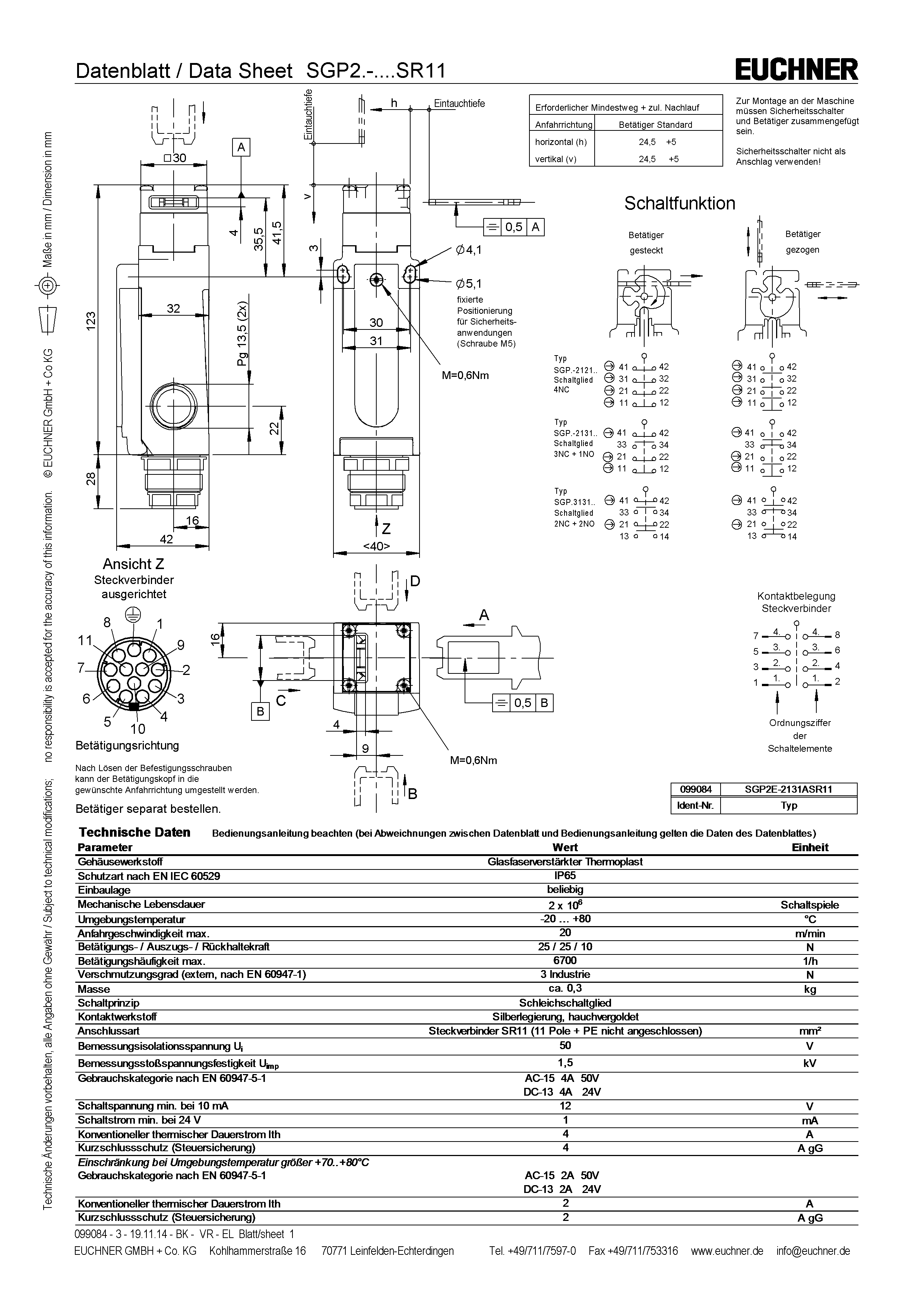 Safety switch SGP, plug connector SR11