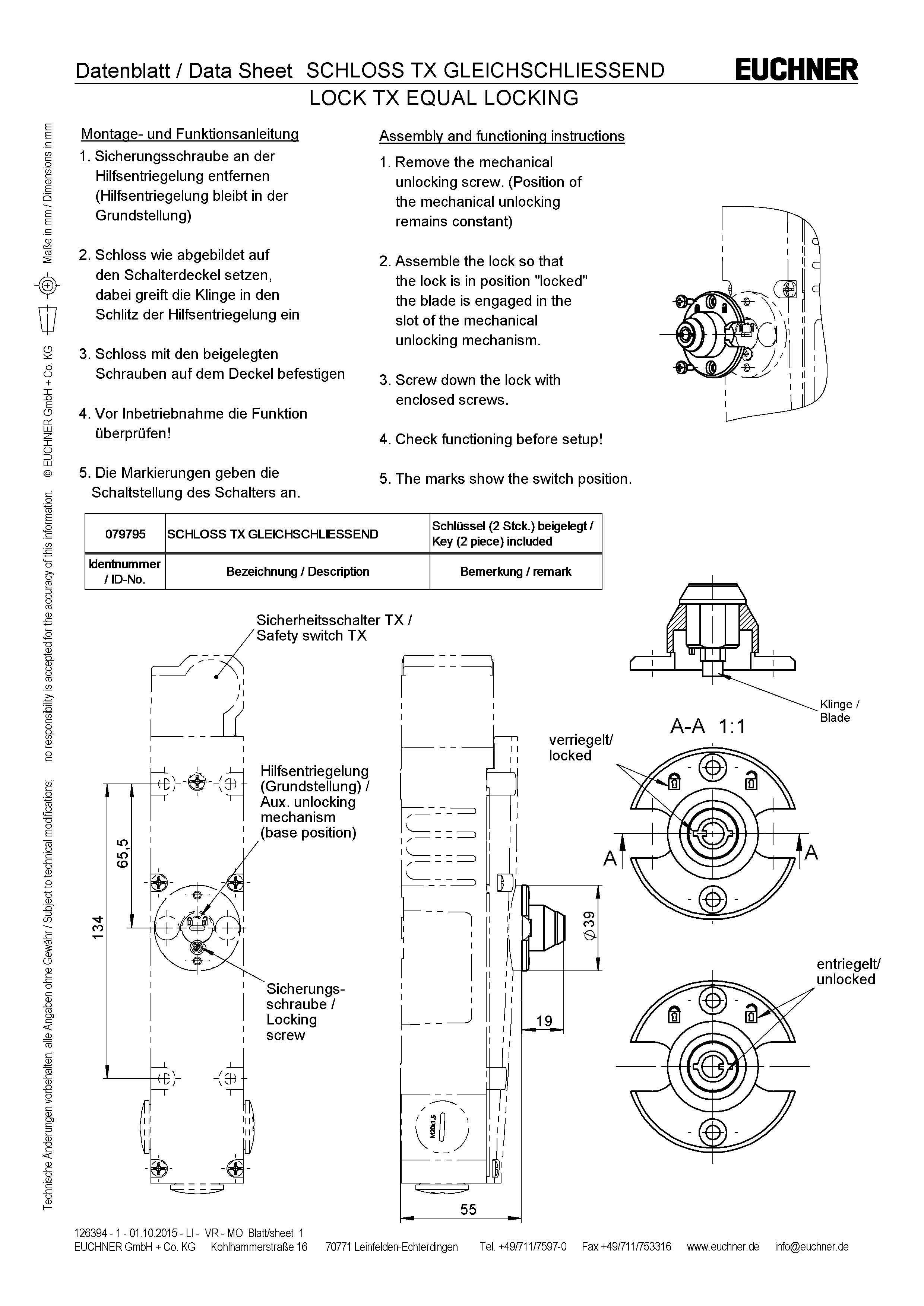 Cette serrure est utilisée avec l’interrupteur de sécurité TX. Le déverrouillage auxiliaire à clé permet dans certaines situations au personnel habilité d’actionner le déverrouillage auxiliaire à l’aide de la clé correspondante. L’électroaimant est alors maintenu en position “ déverrouillé ”. La serrure est montée sur le cache (du déverrouillage auxiliaire) de l’interrupteur de sécurité TX à l’aide de 2 vis.