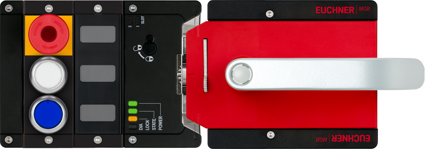 잠금 모듈 MGB2-L1-MLI... (푸시버튼 2개, 비상 스톱, 폐쇄회로 전류 원리, 우측 도어 경첩)