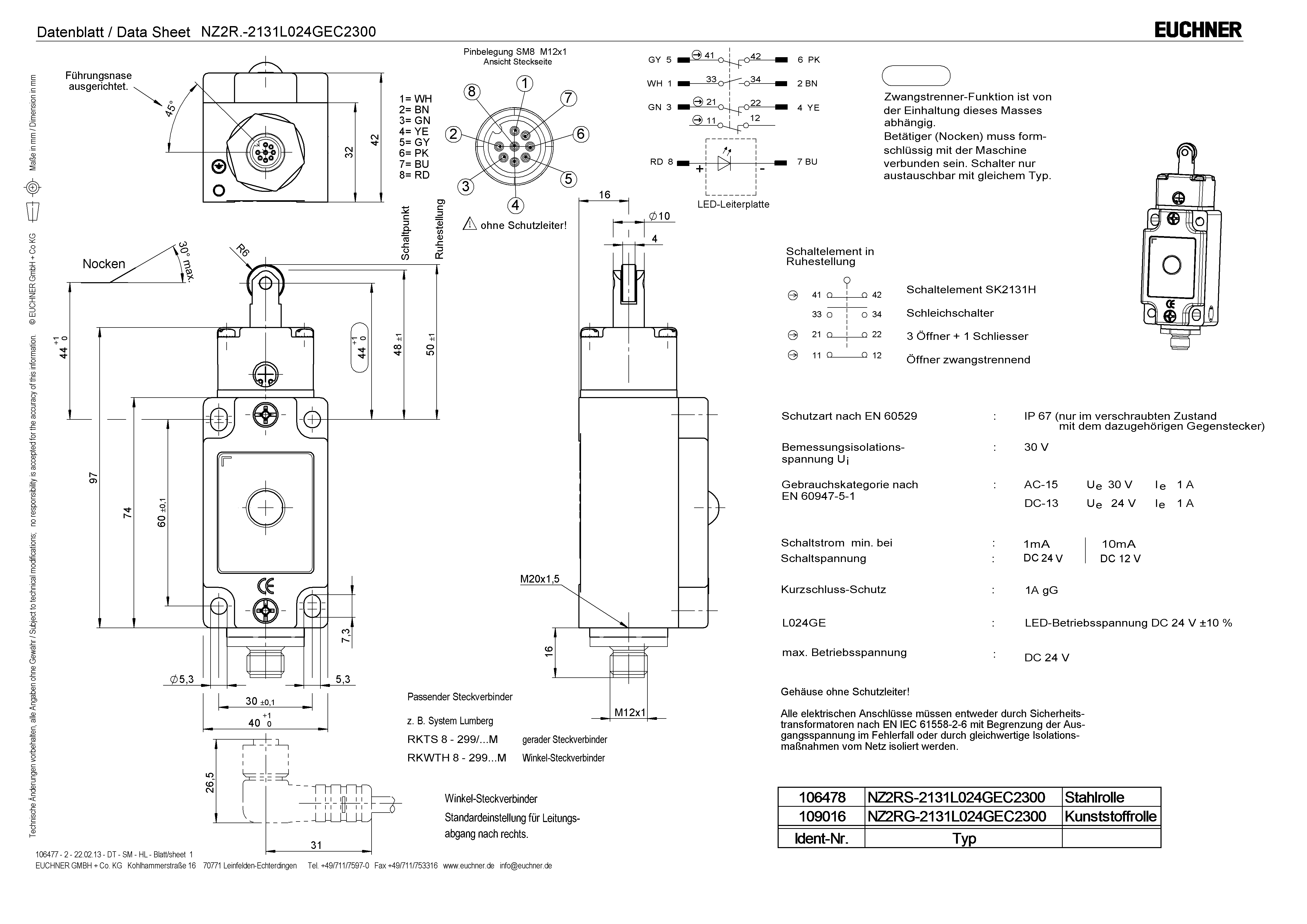 HomeProdukteChaves de segurança eletromecânicas sem bloqueioN1A / NB01 Chave de fim de curso simples, chave de posição NZ e chave de fim de curso embutida EGZNZ2RS-2131L024GEC2300