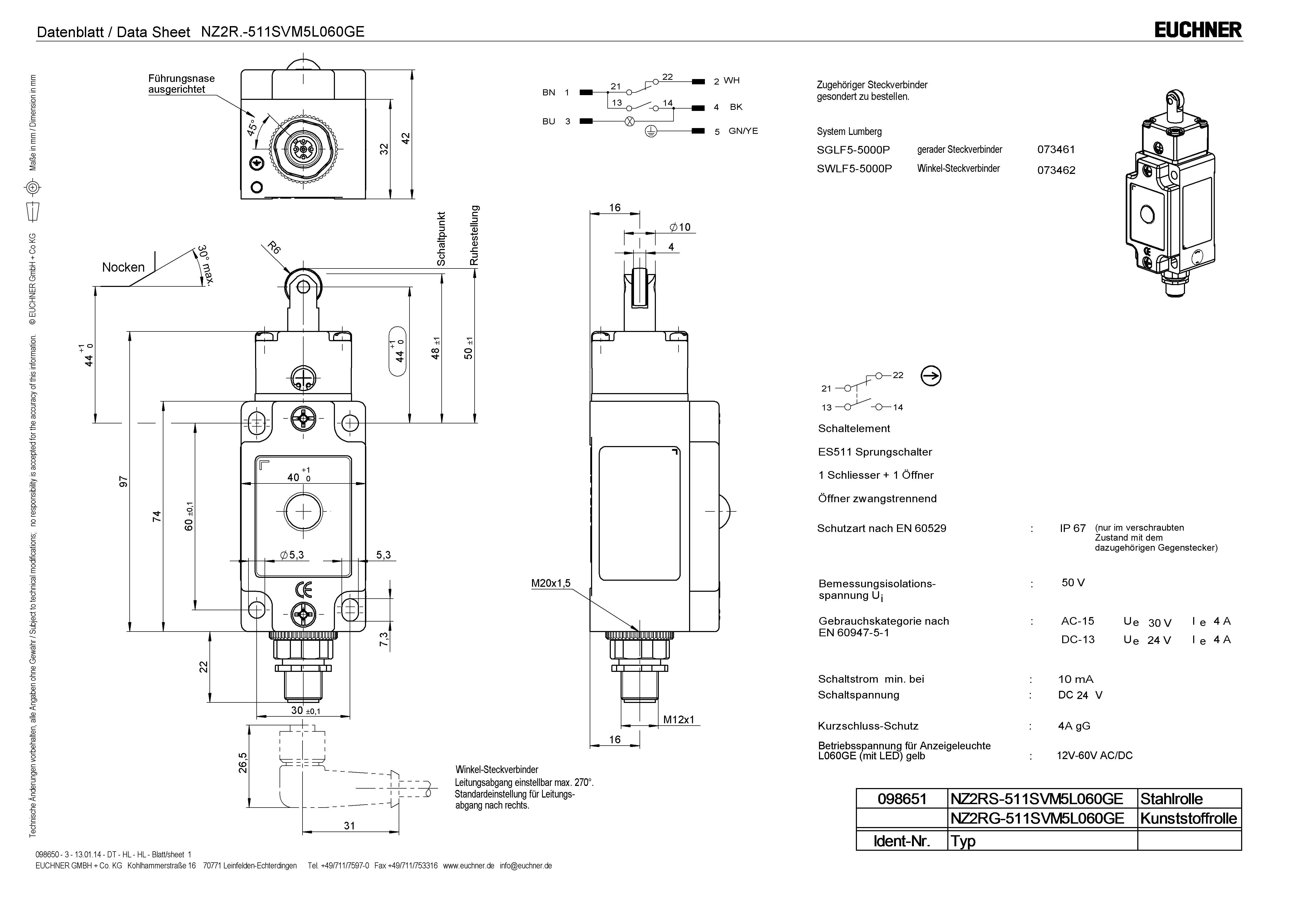 HomeProdukteChaves de segurança eletromecânicas sem bloqueioN1A / NB01 Chave de fim de curso simples, chave de posição NZ e chave de fim de curso embutida EGZNZ2RS-511SVM5L060GE