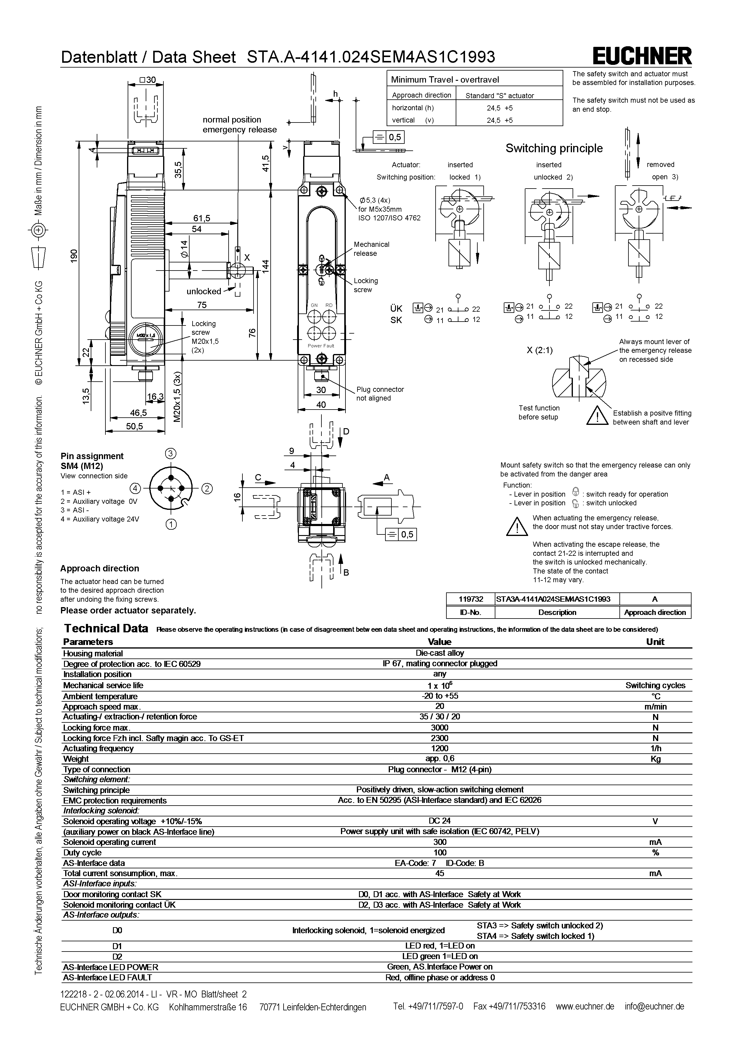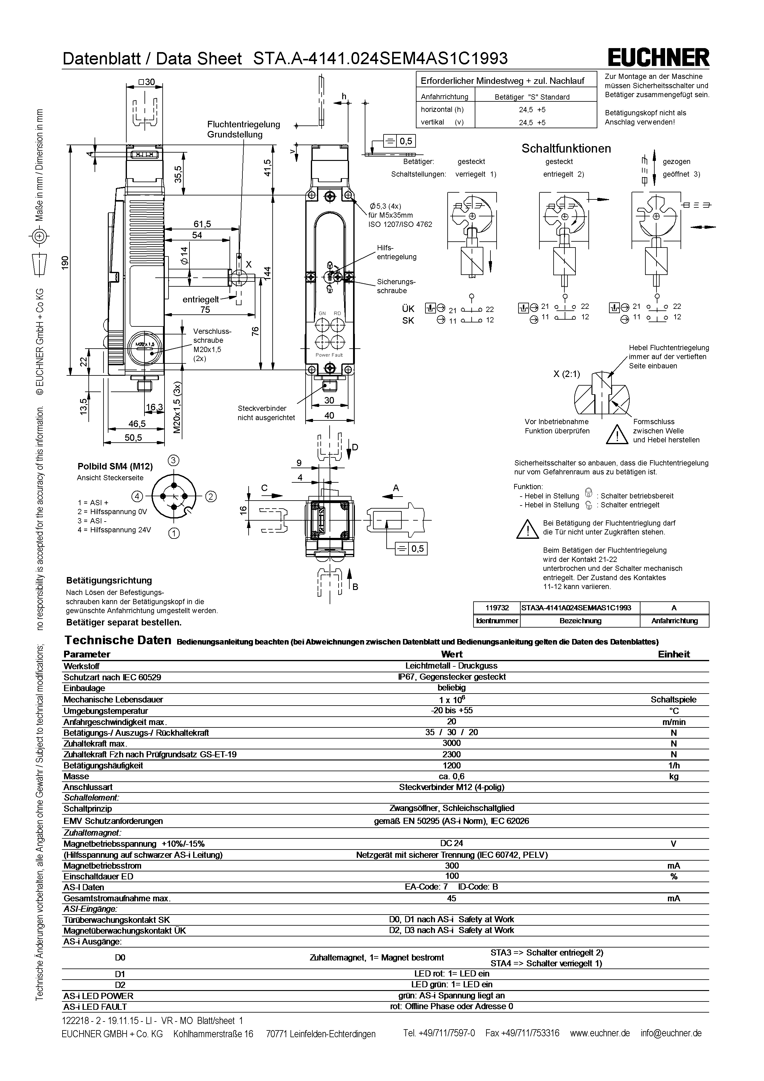| AS-Interface Ausgänge | D0 = Ansteuerung der Zuhaltung, D1 = LED rot, D2 = LED grün |