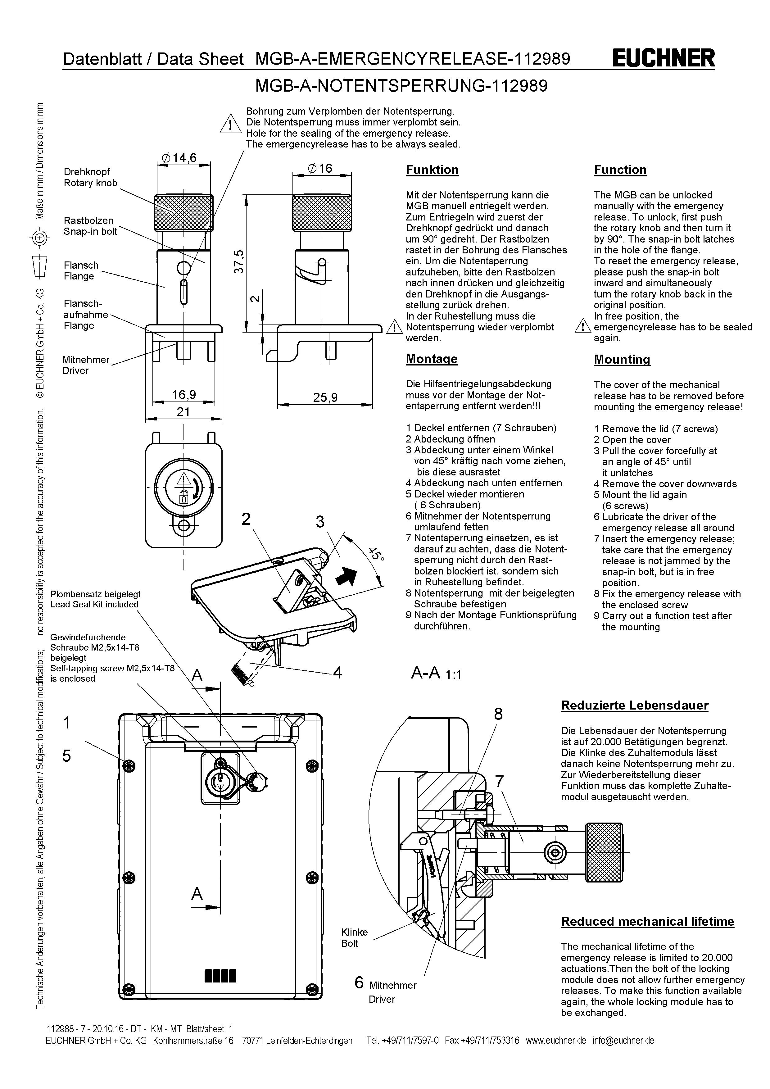 MGB: Montage Tür links, mit Fluchtentriegelung