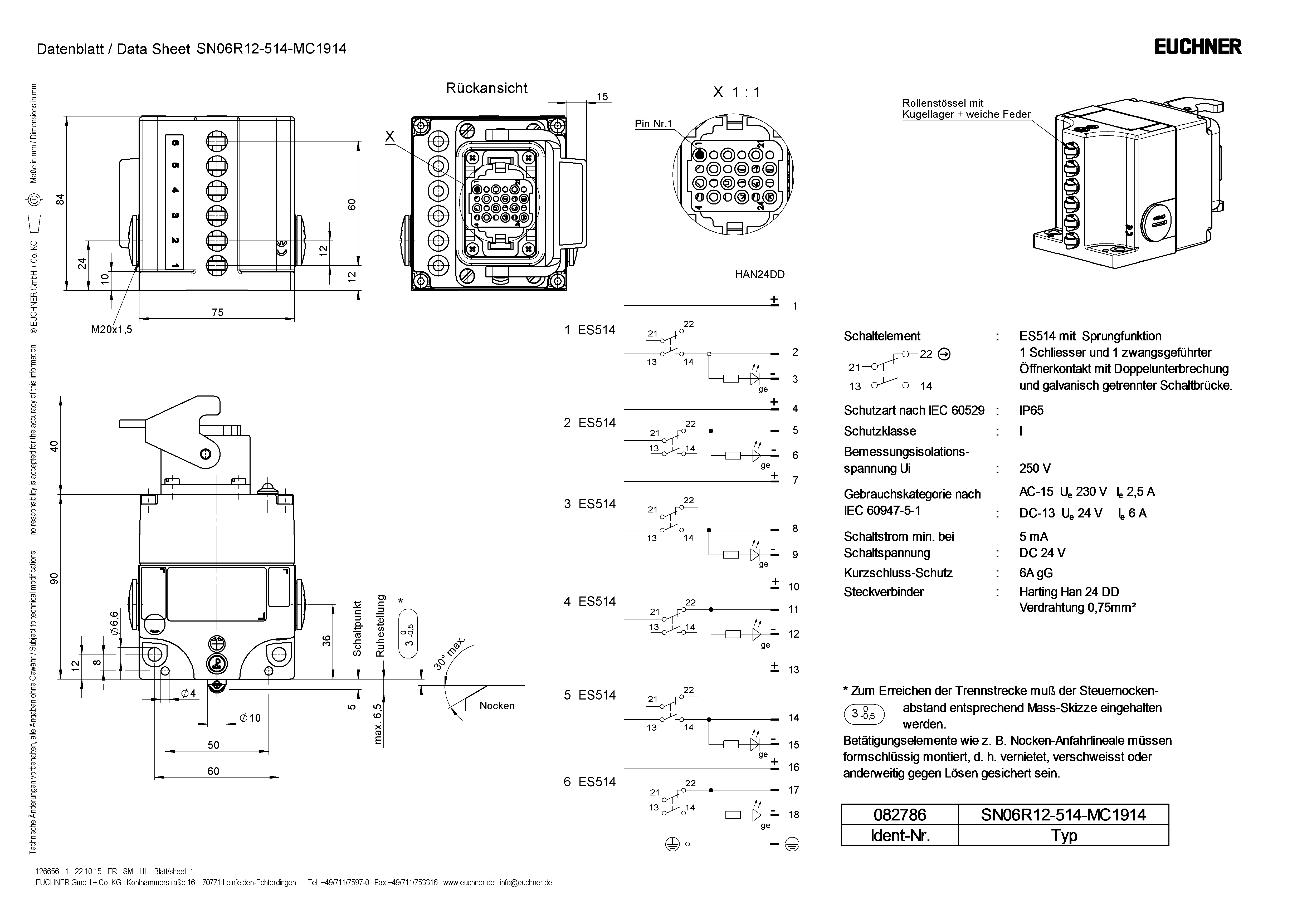 | 7 | Schaltelement ES514 mit Sprungfunktion: 1 Schliesser und 1 zwangsgeführter Öffnerkontakt mit Doppelunterbrechung und galvanisch getrennter Schaltbrücke. |